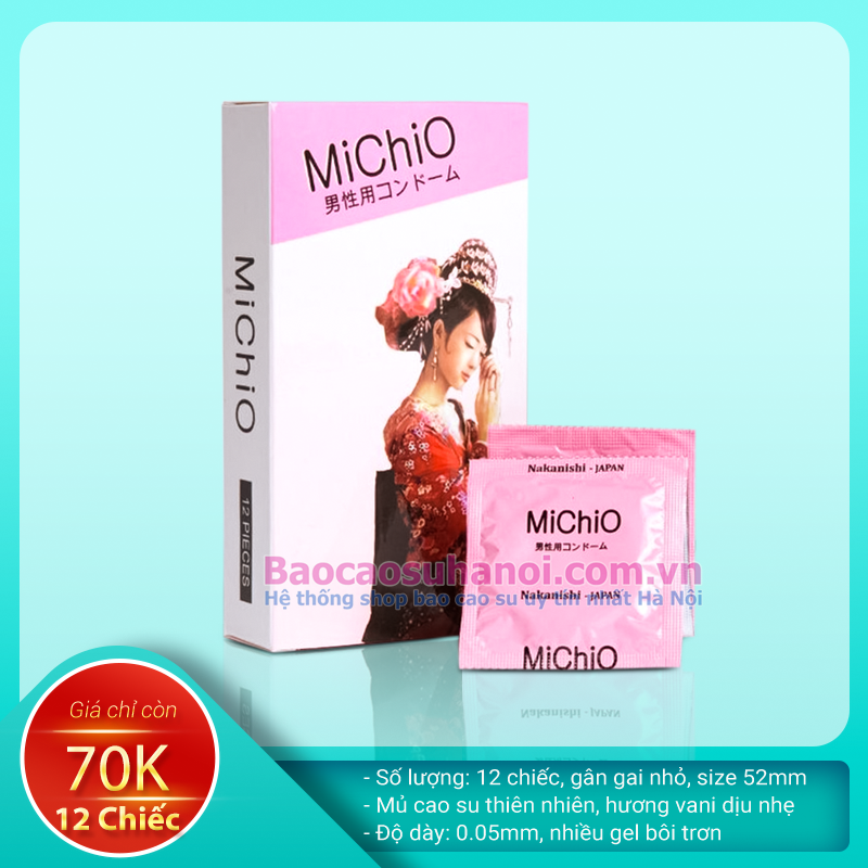 Bao cao su Michio là sản phẩm bao cao su khá nổi tiếng và bán chạy tại Nhật Bản hay ở Việt Nam chúng ta. Vì giá sản phẩm tương đối rẻ nên khá thích hợp dùng cho các cặp vợ chồng hay dùng trong các nhà nghỉ, khách sạn sẽ rất hợp lý