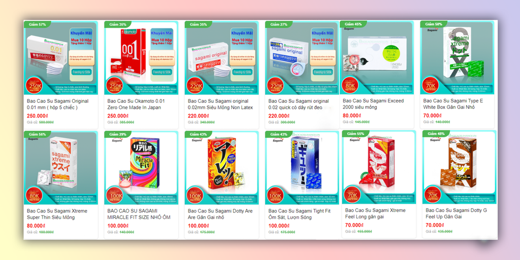 Giá cả minh bạch: Giá sản phẩm được niêm yết công khai, cạnh tranh so với thị trường. Ví dụ, bao cao su Sagami Original 0.02 (hộp 6 chiếc) có giá 220.000 VNĐ, trong khi Sagami Original 0.01 (hộp 5 chiếc) khoảng 250.000 VNĐ.