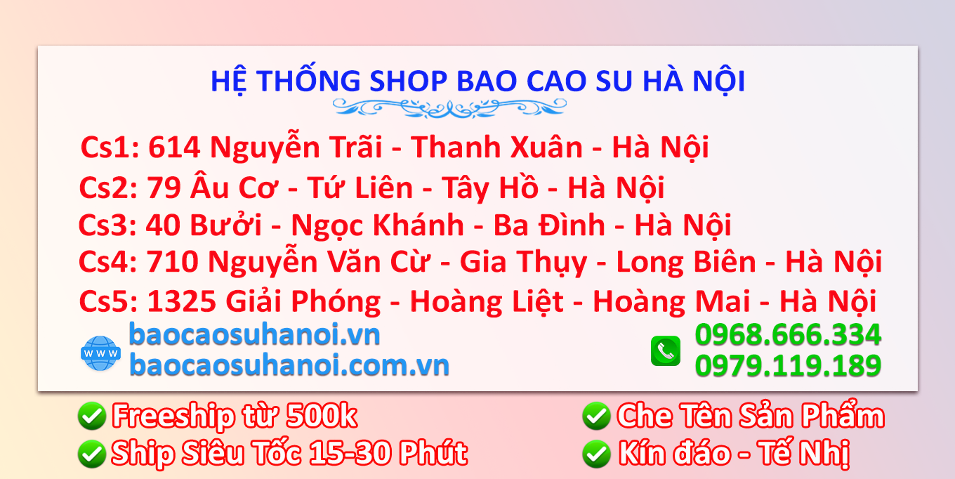 Hệ thống chuỗi nhiều cửa hàng nhất tại Hà Nội: hiện tại hệ thống shop bao cao su Hà Nội có tổng 5 cửa hàng phủ sóng rộng khắp các khu vực Hà Nội nên vô cùng thuận lợi cho quý khách qua trực tiếp mua hoặc đặt hàng online cũng rất nhanh chóng: 15-30 phút